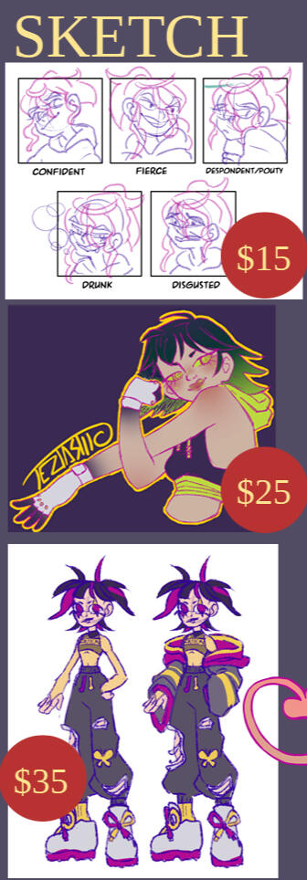 Drawing size: Head - Half – Full - Reference (action or basic)Amount of characters:Polish (ignore for reference sheets): Sketch - Flat - RenderedStyle: Lined - Lineless - lined colourful (additional cost)Background: No - Simple - Complex - UnsureOTHER: