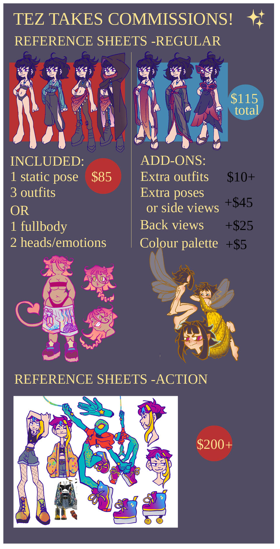 My standard reference sheets come with your choice of 1 fullbody 3 outfits or one fullbody 2 headshots/expressions, with plenty of optional add-ons available including extra outfits or veiws of the character, and a snazzy colour palette for easy colour-picking. These start at $85USD.My action reference sheets are not standard, but generally include more figures/outfits AND expressions, plus any other details in the outfits that require special attention. These thus start at $200USD.