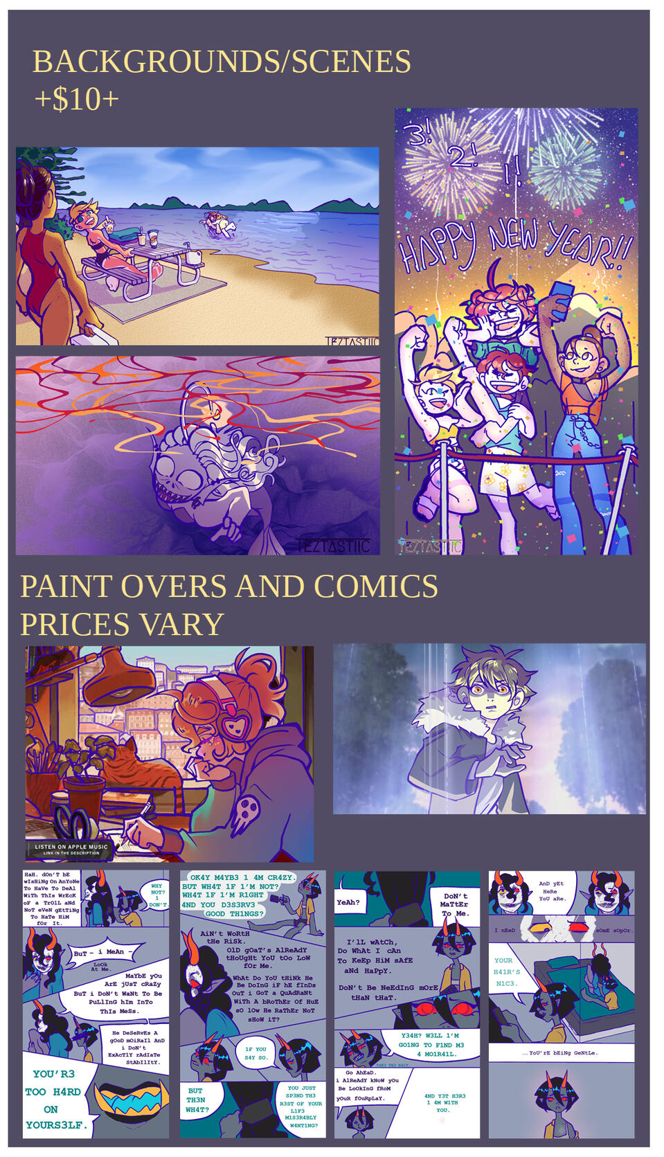 Adding a background to an illustration of a character is a +$10USD minimum, with potential to be much more depending on the complexity of the background, especially in relation to the characters.Paint-overs will depend on the complexity of the piece you'd like me to do in my style, though I insist that any image you provide me for this service be copyright-free (ie stock photos, memes, show screenshots, or anything that is otherwise public domain). If I find that I am being knowingly asked to paint over someone's original work, you'll be blacklisted.Comics are not something that I have charged for before, though there is a $50USD minimum on ANY comic page I draw, no matter how basic. Yes, even for a single-panel page