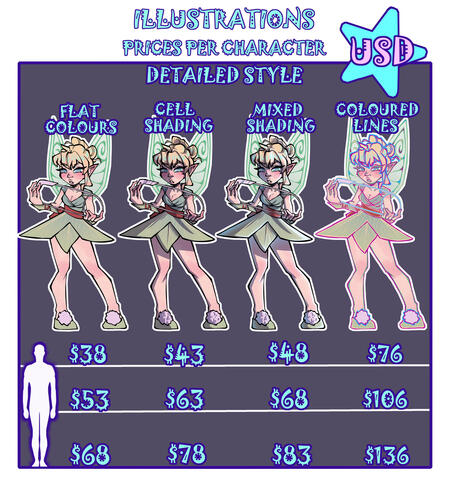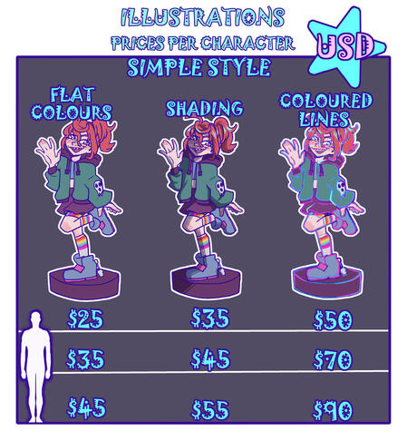 -I will not begin the commission until I have all the required references/information and full payment. Payment plans or 50/50 methods can be discussed privately for commissions $300 or over, but otherwise, payment is taken in full upfront.-I take payment ONLY via paypal or Vgen. My prices are in USD.-If commissioning a piece with more than one character present: First character's price is determined with the prices on my sheet. Adding characters after that adds 100% of that original price. For example, a simple style shaded halfbody piece ($45), would be $90 for two characters. The background, if applicable, is calculated separately and varies depending on the subject.4.Refunds and Revisions-I will not refund or redo your commission if you are not satisfied with the end result. As detailed in my process section (1), you will be sent multiple updates/revisions throughout the commissioning process to ensure your satisfaction. If you do not utilize these, I will not be held accountable for your dissatisfaction. It is your responsibility as the commissioner to decide personally if my art is for you. I do not copy other people's personal styles.-I will only refund you in the event that there was a finish date set in place, I was unable to complete the piece in time, and you no longer want/need the artwork. You will receive a full refund in this case. If you still want/need the artwork, the refund will be partial.5.Contact