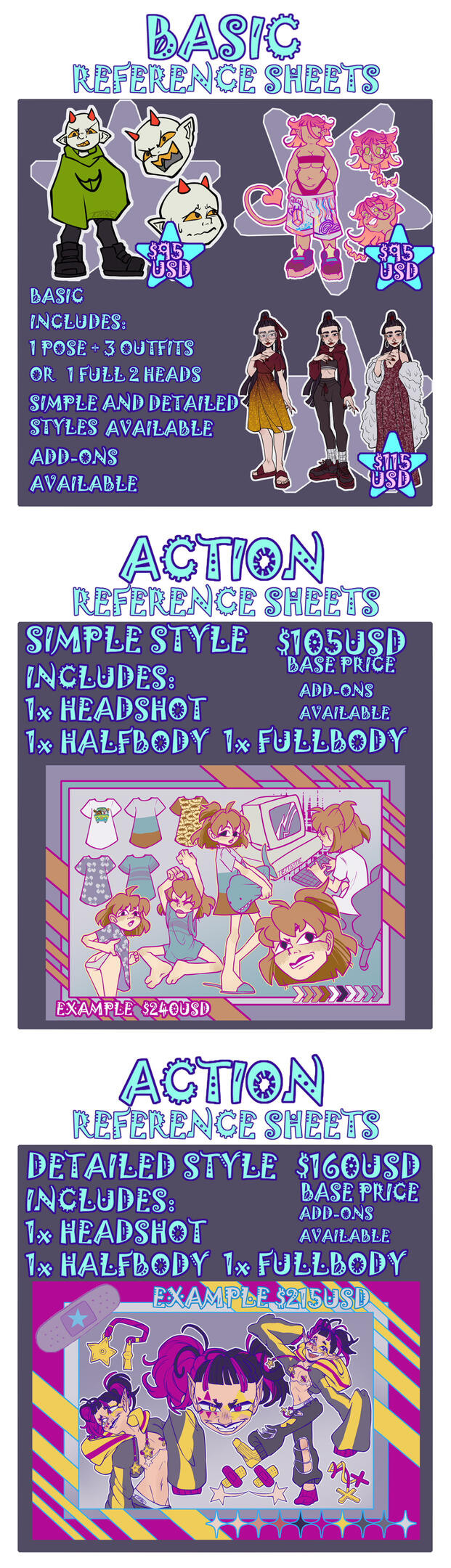 There are plenty of optional add-ons including extra fullbodies, headshots, outfits, and back views, as well as a personalized background and colour palette. These start at $95USD for simple style, and $115USD for detailed styleMy action reference sheets are much more custom. They include one headshot, one halfbody and one fullbody in the base price ($105USD for simple style and $160USD for detailed style).There are plenty of optional add-ons including extra fullbodies, halfbodies, headshots, outfits, back views, and detail shots, as well as a personalized background and colour palette.